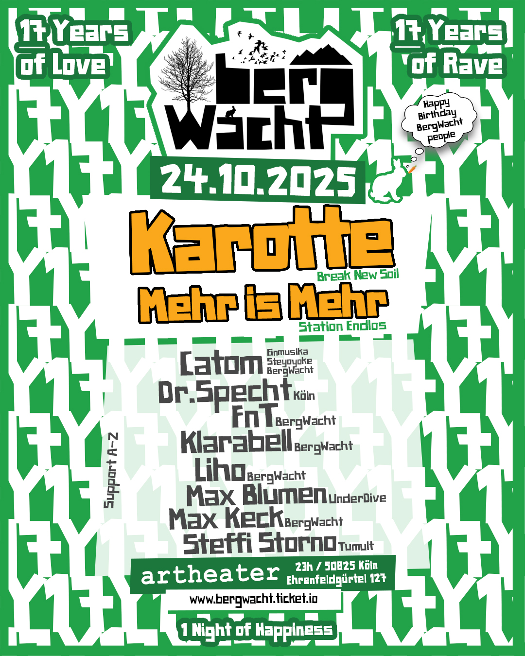 17 Jahre BergWacht – das sind 17 Jahre voller Musik, Freundschaft, Emotionen und unzähliger gemeinsamer Nächte. Dieses Jubiläum wollen wir mit euch so feiern, wie wir es am liebsten tun: mit einem Programm aus Herzblut, Leidenschaft und voller Ekstase. Dazu dürfen natürlich unsere Residents Heros und befreundete Lokals nicht fehlen. Zusätzlich eingeladen wurden Steffie Storno (Tumult), Max Blumen (UnderDive) und Dr. Specht. Von den Bergwacht Residents werden Catom und Max Keck, Karotte im Saal supporten, Mehr is Mehr bekommt Unterstützung von Klarabell, FnT und Liho.
