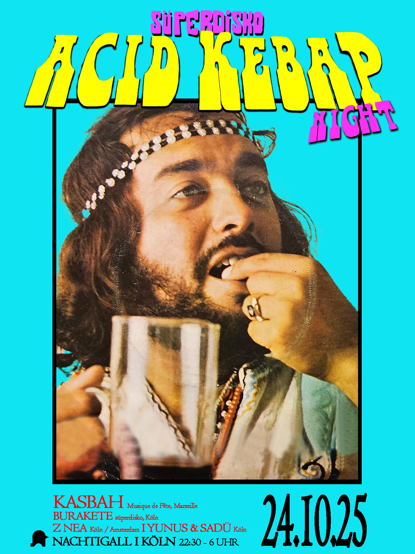 Acid Kebap oder Disko Hamam? SÜPERDISKO ist Manifest & Ekstase: Turkish Funk trifft Clubbeats, Halay & Dabke sprengen nicht nur GenreGrenzen. Wenn SWANA Hits im Re-Edit auferstehen und neue postmigrantische ElektroBanger Hüften kreisen und Arme hochreißen lassen, definiert der Baba aller postmigrantischen Clubnights mit der ACID KEBAP NIGHT die Grenzen elektronischer Clubmusik neu. Der Name ist Programm! Wir feiern die Premiere mit einem der aktuell heißesten Acts der Szene: