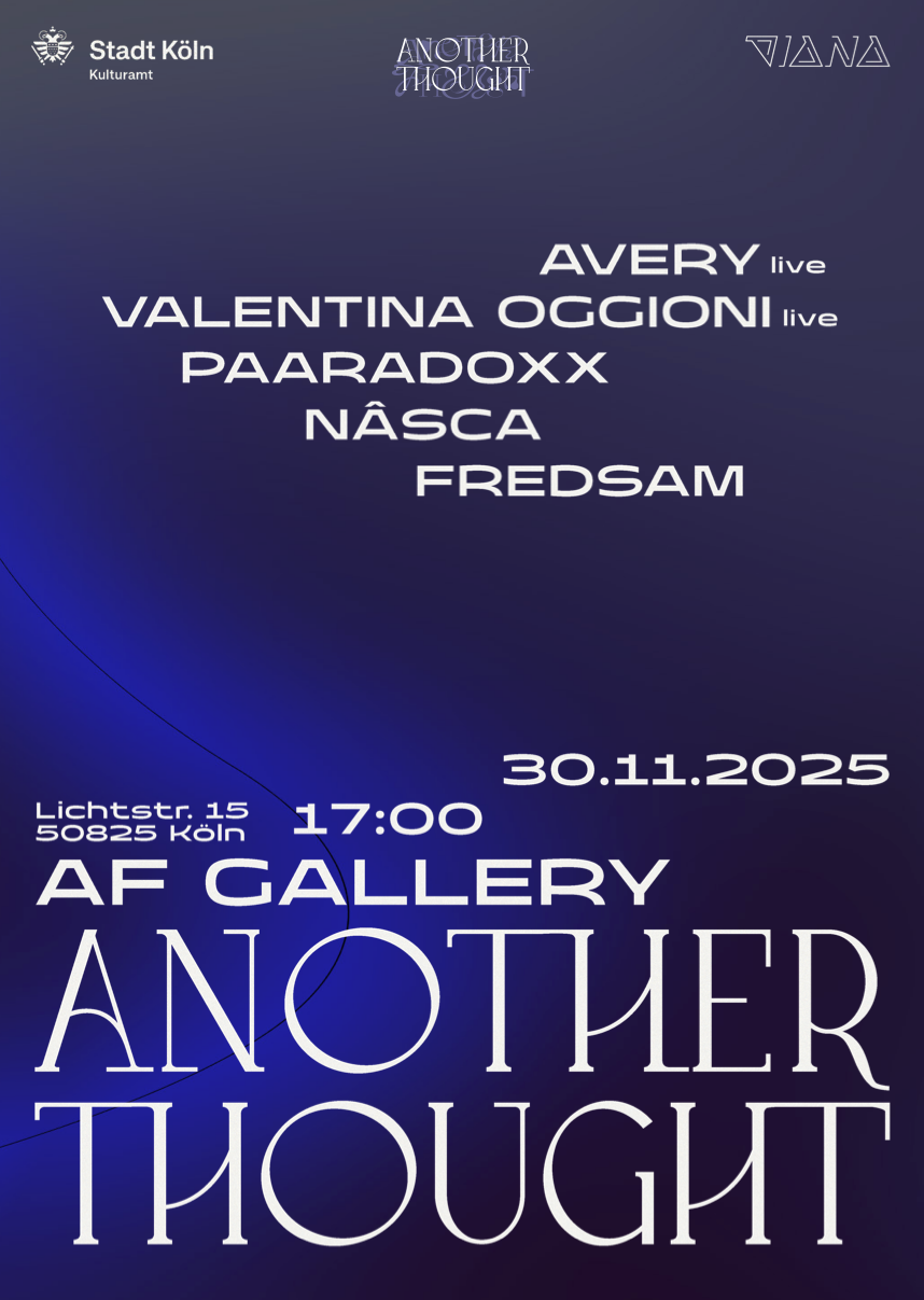 Zusammen mit unseren Freundinnen vom DIANA Kollektiv laden wir euch zur diesjährigen Ausgabe von another thought ein - aufgeteilt in zwei Abendveranstaltungen, wie zwei Seiten der gleichen Münze; Zwei Abende geprägt vom elektronischen Sound der Gegenwart und einem Durchschimmern von Pop. Am 30.11. geht es los mit einer besonderen Listening Session in der AF Gallery.