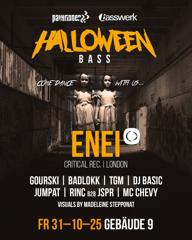 Zu den special guests gehören außerdem, local hero GOURSKI und BADLOKK von Hanzom Music. Die Crews von Basswerk und Pathfinder treten in Bestbesetzung an. Eine besondere Premiere gibt es auch bei den Visuals. Für die Bild & Videomix-Projektionen ist in Vertretung für VJ Sehvermögen Madeleine Stepponat verantwortlich. See you soon oder sollten wir besser sagen Trick or Treat ;-)