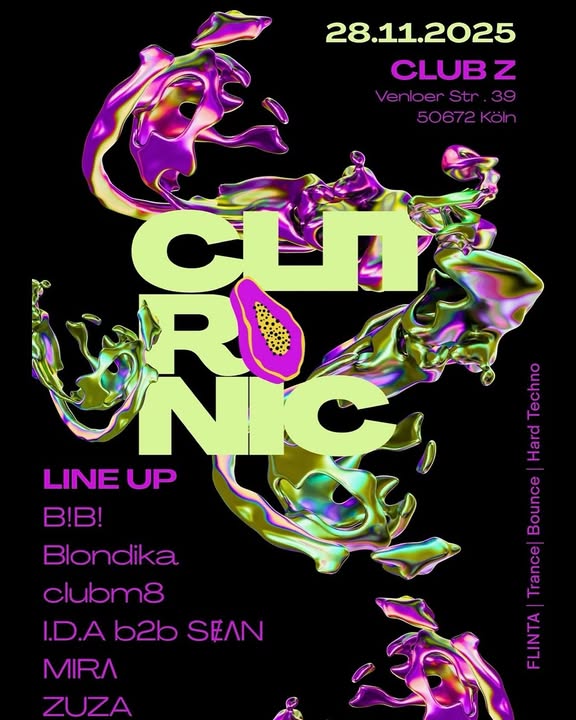 Am 28. November feiern wir die Clitronic-Nacht im legendären Club Z. Zwischen rohem Beton, sattem Bass und flackerndem Licht entsteht der Space, in dem wir gemeinsam tanzen, schwitzen und die Nacht neu schreiben.