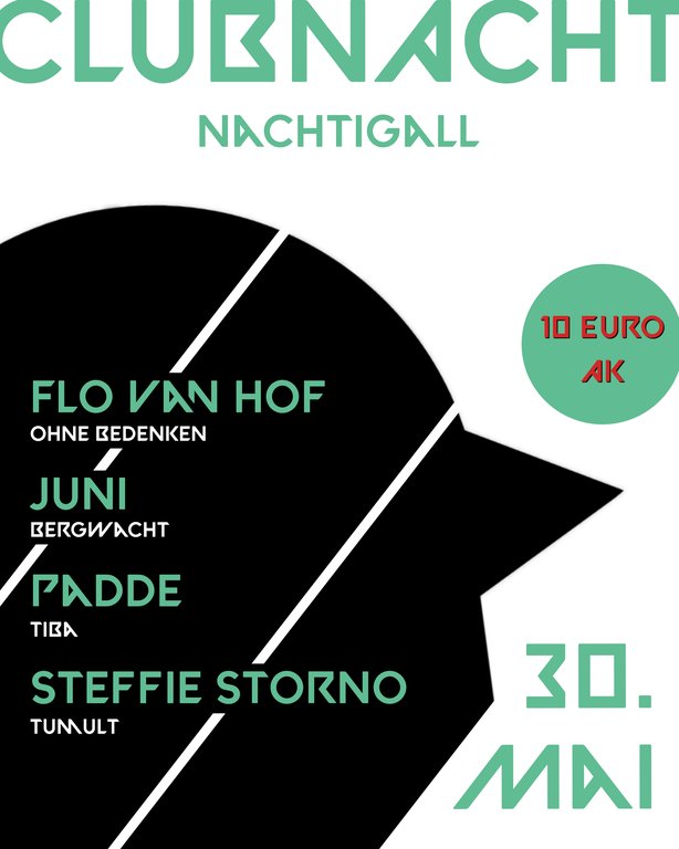Am 30. Mai feiern wir CLUBNACHT. Diesmal mit Steffie Storno vom TUMULT Festival, Padde von TIBA, Juni von der BERGWACHT und Flo Van Hof von OHNE BEDENKEN.