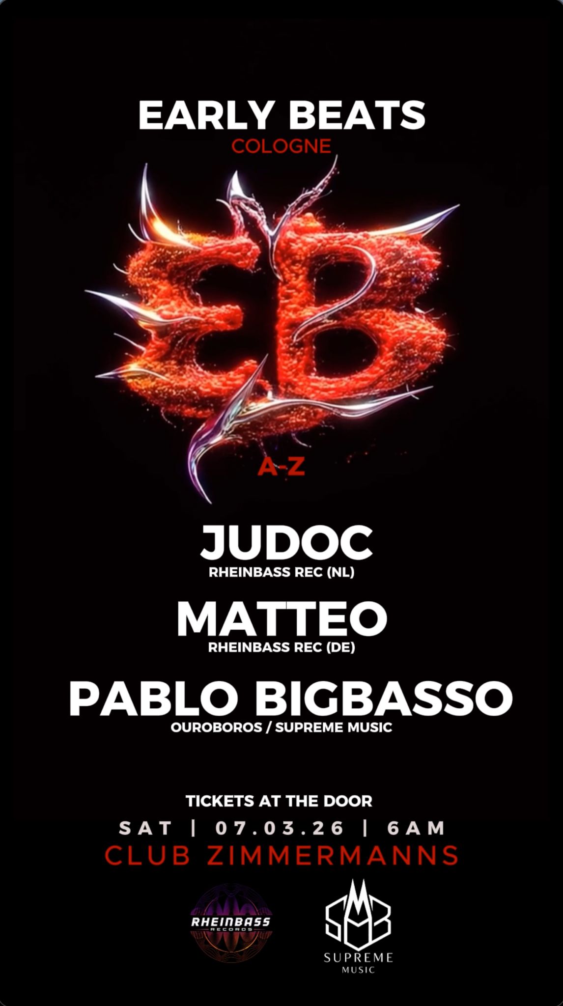 EARLY BEATS 02 Afterhour l Underground Before the sun. After the noise. 07.03 · Afterhour Club Zimmermanns lineup. Judoc · Matteo · Pablo Bigbasso Low light. Deep frequencies.