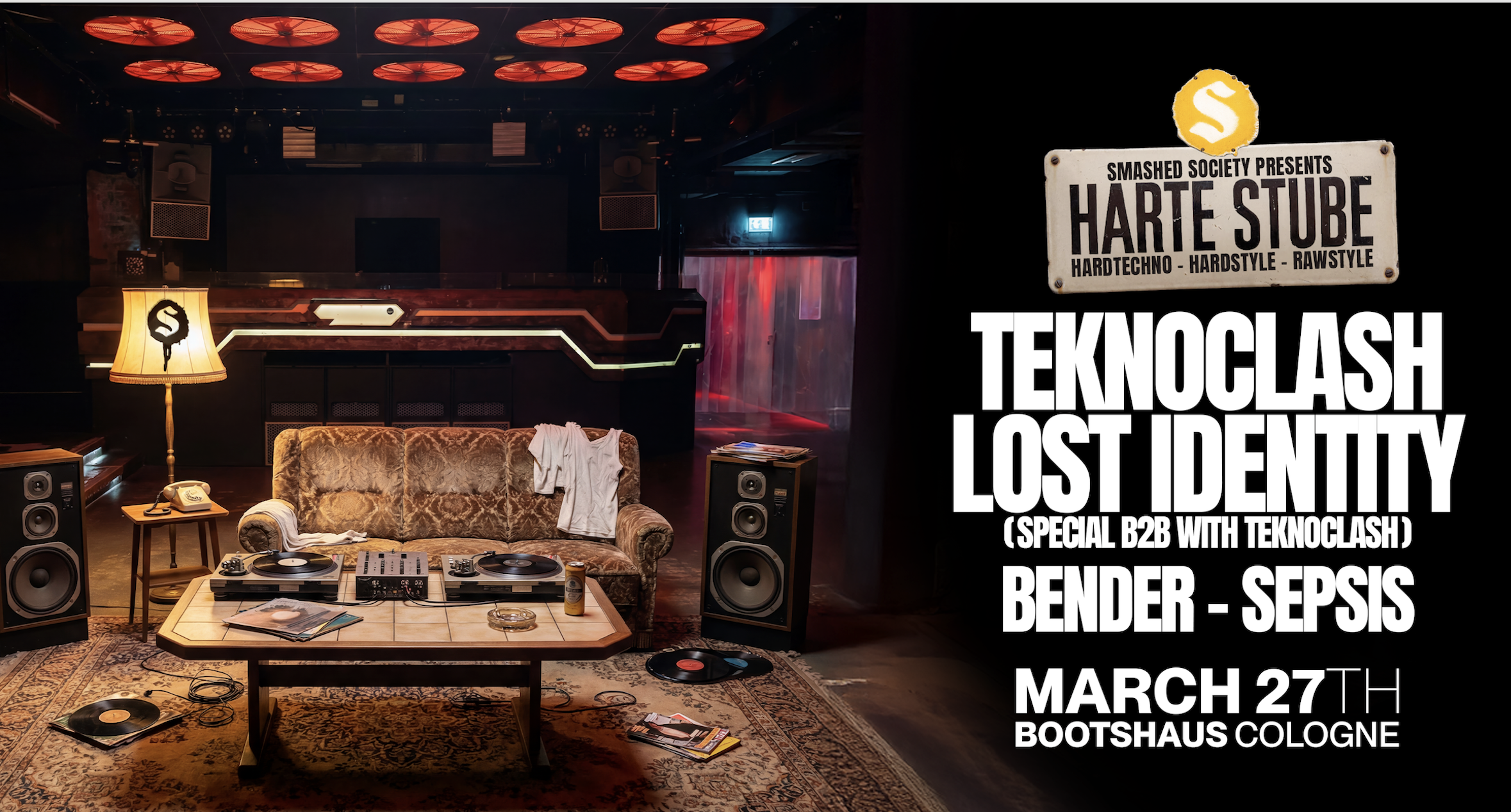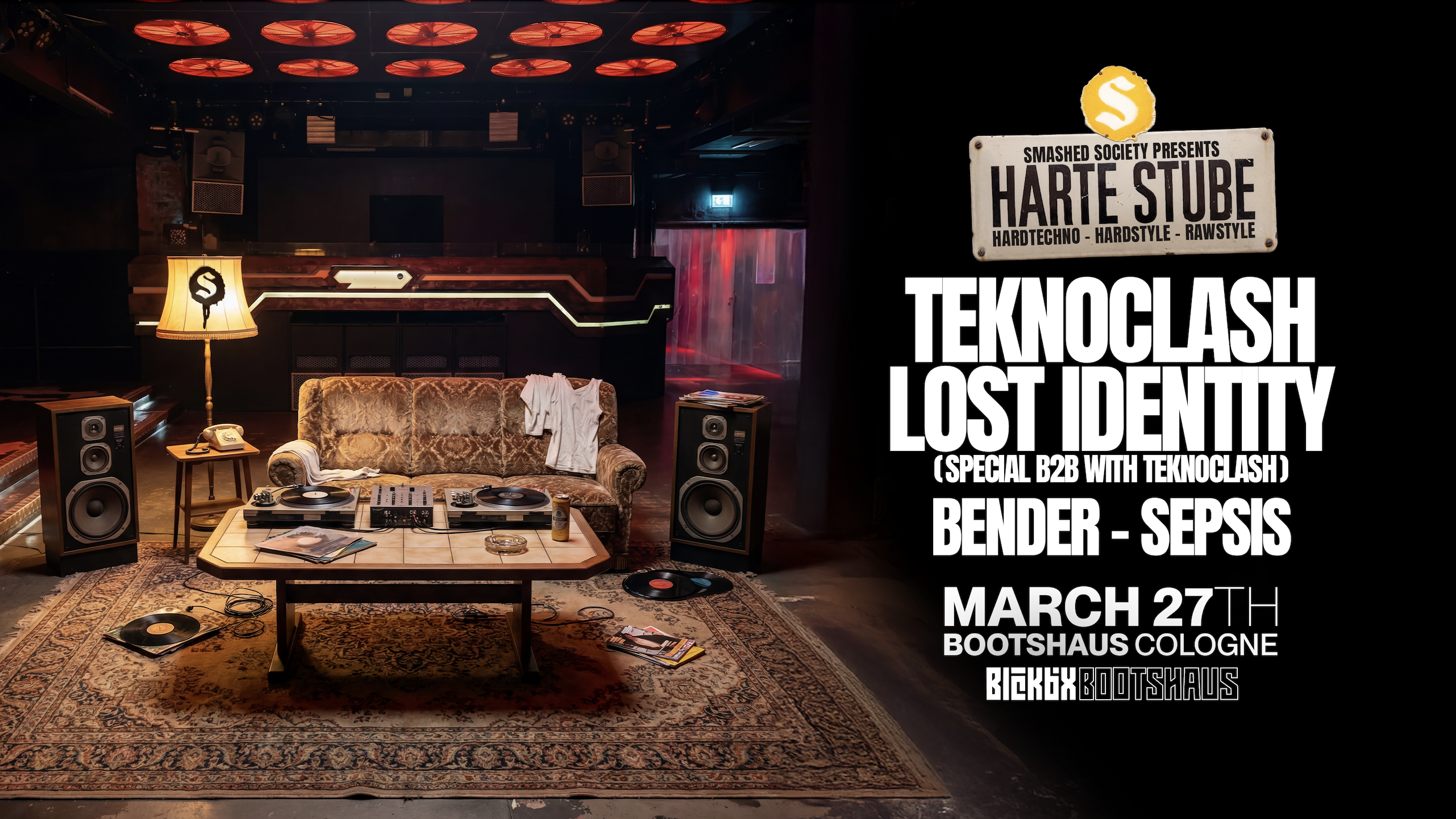 HARTE STUBE takes over the BLCKBX and turns it into a living room from grandma‘s times. 🔥 On March 27th, Bootshaus and Smashed Society brings the hardstyle energy back to its roots with a never seen unique rave experience. The DJ booth moves into the center of the BLCKBX, built as an open, walkable stage that looks like a gritty 80s working-class living room:couch, coffee table, floor lamp, beer crates, oversized ashtrays: rough, dirty, and real. We start with Hardtechno, move to Hardstyle and close things off with Rawstyle!