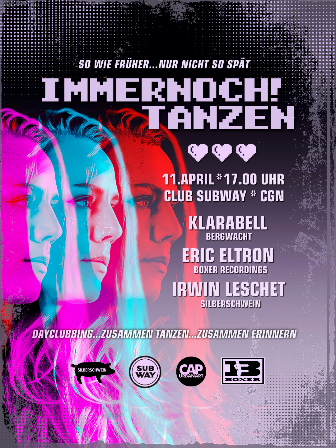 Immernoch! Tanzen. Dayclubbing für alle, die sich wiedererkennen. Zusammen tanzen. Zusammen erinnern. So wie früher, nur nicht so spät…