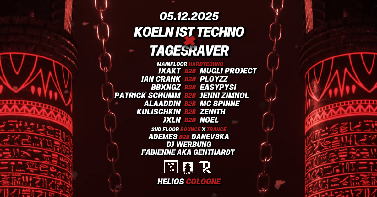 KOELN IST TECHNO x TAGESRAVER w/ IXAKT, ADEMES, IAN CRANK, MUGLI PROJECT, PLOYZZ, ALAADDIN, BBXNGZ UVM. @ HELIOS [ 05.12.25 ]