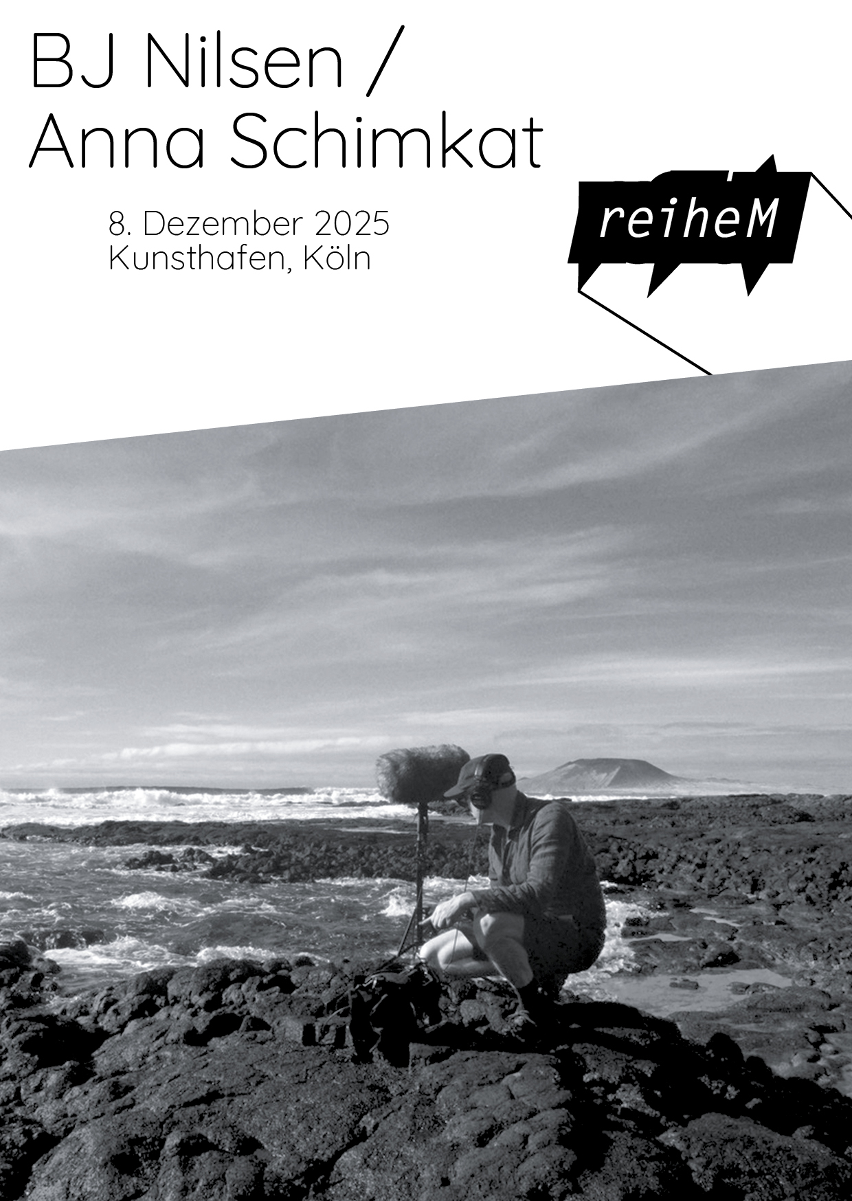 An diesem reiheM-Abend werden zwei Varianten von Geräuschmusik präsentiert: BJ Nilsen erschafft raumfüllende, quadrophonische und geheimnisvolle Klanglandschaften, in denen elektronische Klangmanipulationen und Feldgeräusche miteinander verwoben werden. Der Raum wird Sound. Anna Schimkat lässt als Performerin die Geräusche vor den Augen und Ohren des Publikums entstehen und bearbeitet diese in Echtzeit. Im Kölner Konzert benutzt sie Wasser als Ausgangsmaterial.