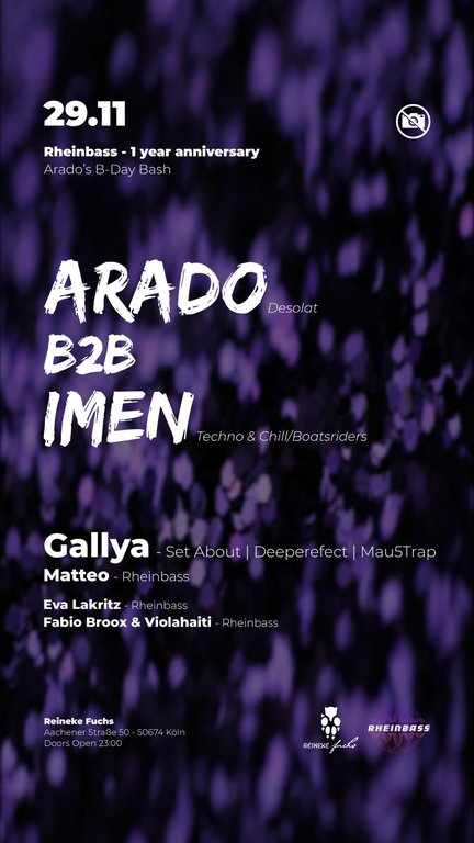 Rheinbass übernimmt zum ersten Mal die Reineke Fuchs, um sein einjähriges Jubiläum und Arados Geburtstagsparty zu feiern. Eine unvergessliche Nacht, präsentiert von Rheinbass und Suprememusic (Booking & Artist Care), mit internationalen Top-Gästen und den besten lokalen Talenten. Freut euch auf erstklassigen Sound, treibende Grooves und die unverwechselbare Rheinbass-Energie, die die Kölner Szene im letzten Jahr geprägt hat. Seid dabei ab 23:00 Uhr bis spät in die Nacht.