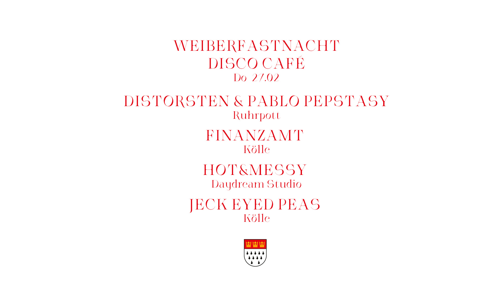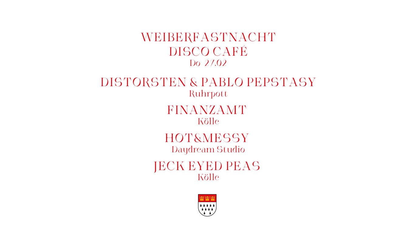 Weiberfastnacht powered by Disco-Café w/ Distorsten, Pablo Pepstasy, Finanzamt, Hot & Messy & Jeck Eyed Peas. Starts at 18h.