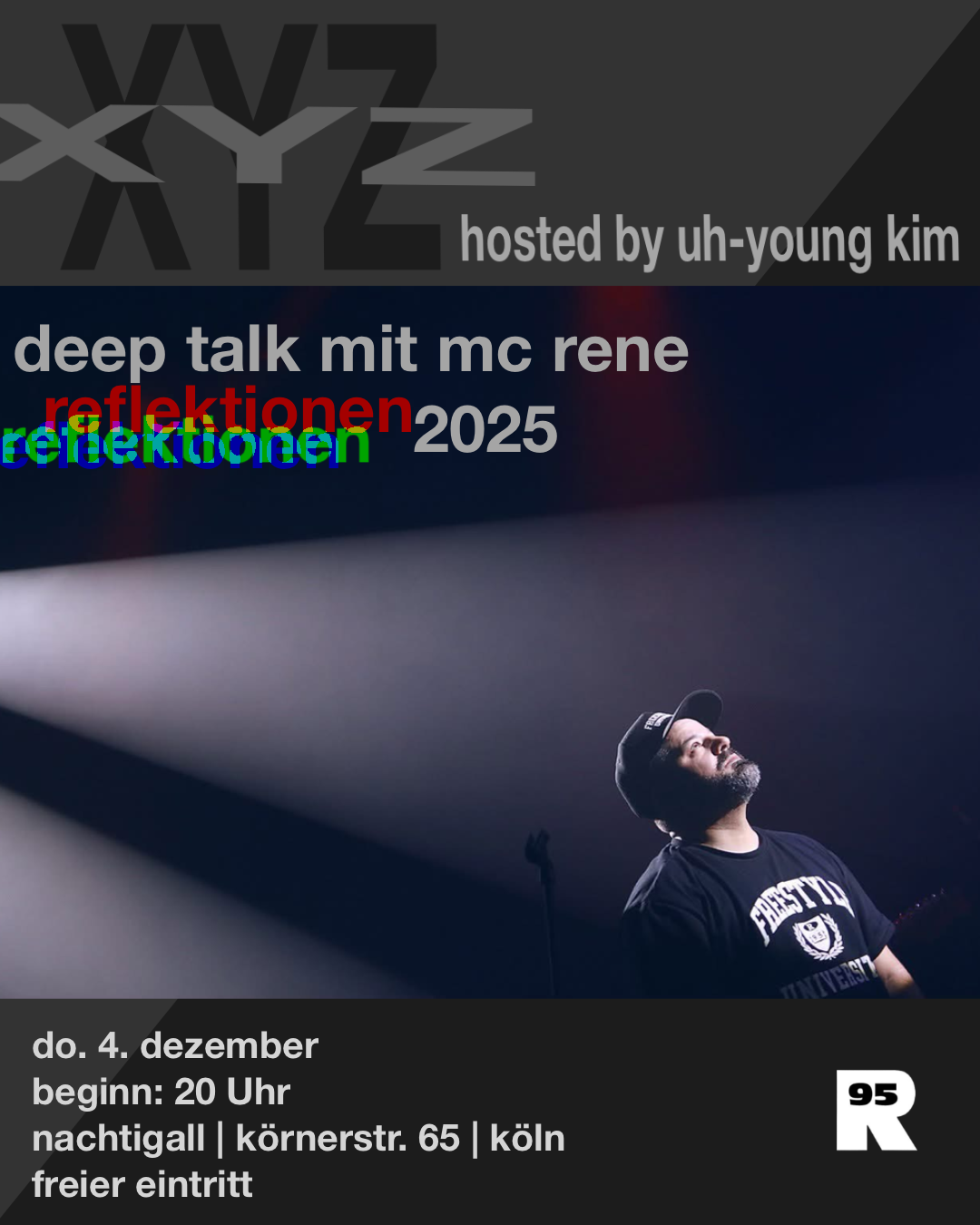 Mit seinen Essays im Gepäck reflektieren MC Rene und 𝑋𝑌ℤ Host Uh-Young Kim das Jahr 2025 live im Nachtigall.